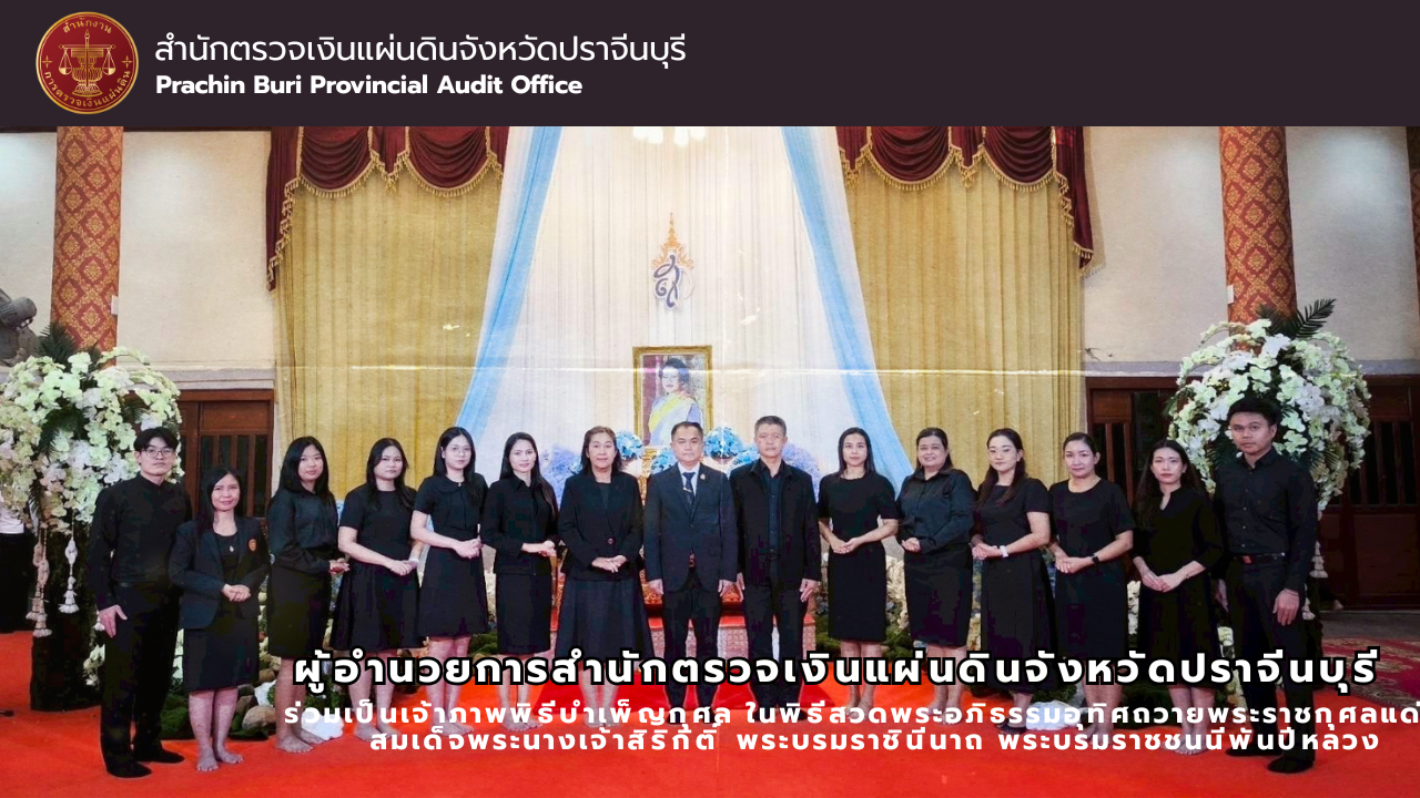 14 พฤศจิกายน 2568 สำนักตรวจเงินแผ่นดินจังหวัดปราจีนบุรี ร่วมเป็นเจ้าภาพพิธีบำเพ็ญกุศล ในพิธีสวดพระอภิธรรมอุทิศถวายพระราชกุศลแด่ สมเด็จพระนางเจ้าสิริกิติ์ พระบรมราชินีนาถพระบรมราชชนนีพันปีหลวง