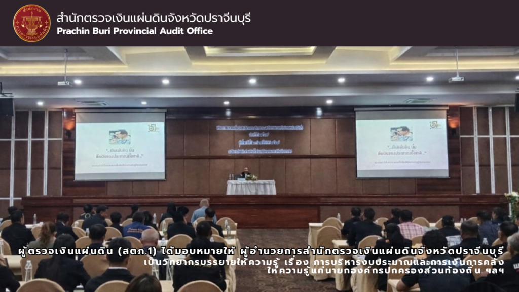 เมื่อวันที่ 20 มีนาคม 2569 นายสุทธิ สุนทรานุรักษ์ ผู้ตรวจเงินแผ่นดิน (สตภ.1) ได้มอบหมายให้ นายวรวิทย์ นุชอินทรา ผู้อำนวยการสำนักตรวจเงินแผ่นดินจังหวัดปราจีนบุรี พร้อมด้วยเจ้าหน้าที่สำนักตรวจเงินแผ่นดินจังหวัดปราจีนบุรี เป็นวิทยากรบรรยายให้ความรู้ เรื่อง การบริหารงบประมาณและการเงินการคลัง ให้ความรู้แก่นายกองค์กรปกครองส่วนท้องถิ่น รองนายกองค์กรปกครองส่วนท้องถิ่น ที่ปรึกษานายกองค์กรปกครองส่วนท้องถิ่น และเลขานายกองค์กรปกครองส่วนท้องถิ่นในจังหวัดปราจีนบุรี ณ อิงธารรีสอร์ท ต.หินตั้ง อ.เมืองนครนายก จ.นครนายก ซึ่งวัตถุประสงค์เพื่อเพิ่มประสิทธิภาพการบริหารงาน และกิจการสภาองค์กรปกครองส่วนท้องถิ่น